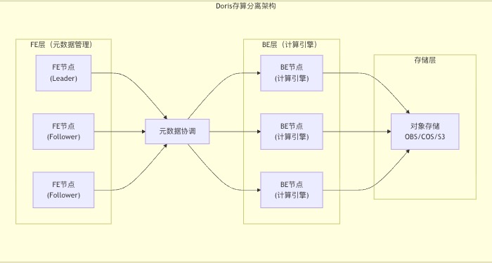 Doris 3.x版本支持存算分离架构,将计算资源与存储资源解耦,带来多重优势: