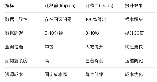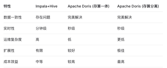 与Impala+Hive的存算分离架构不同,Doris采用存算一体设计,元数据更新与数据操作原子性同步完成。数据一旦写入成功,立即可查,从根源上消除了元数据不一致的可能性。