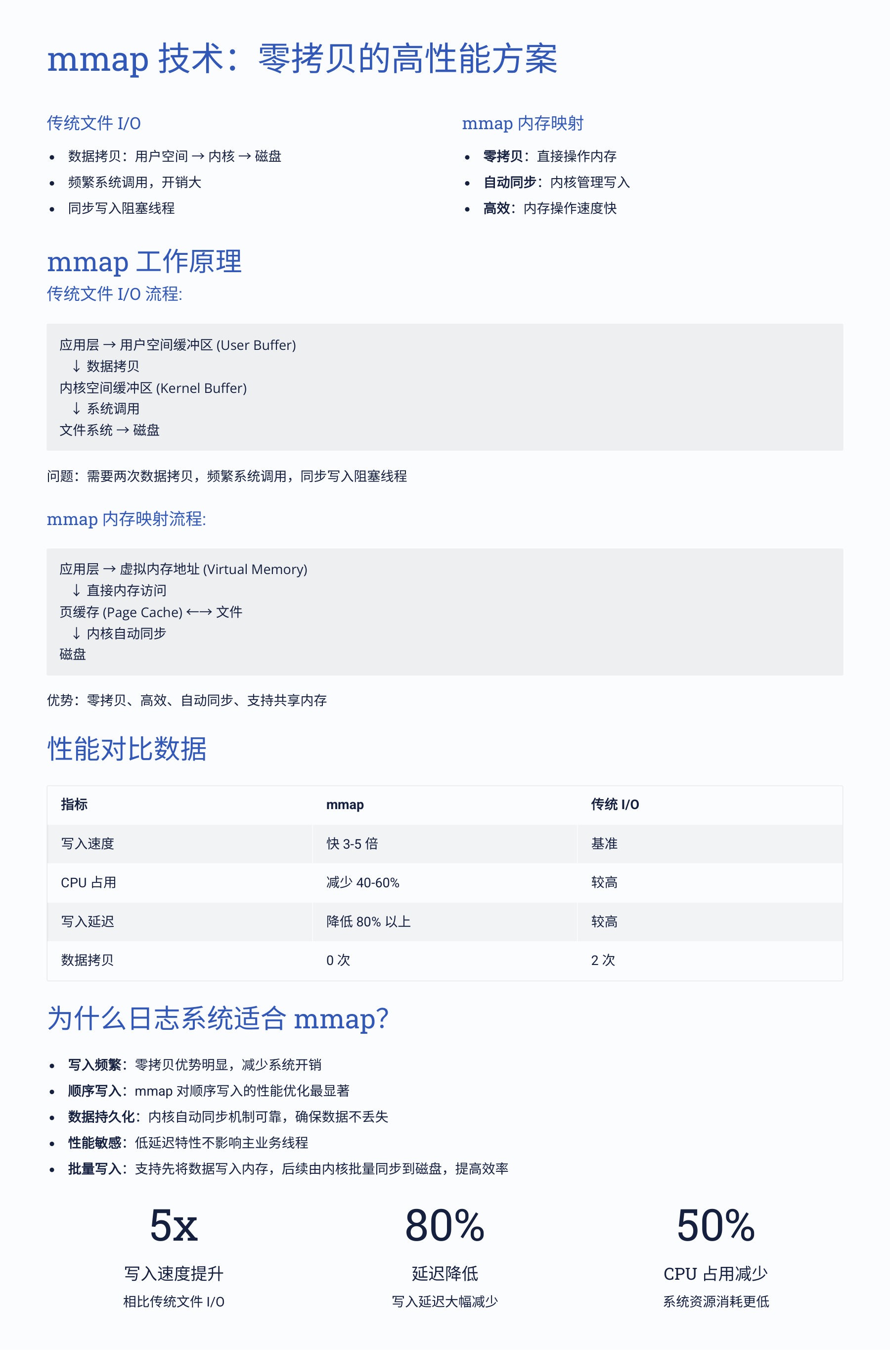 这也是为什么大量成熟移动端日志方案会落到 mmap + 异步刷盘这条路线上。