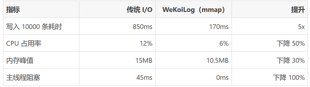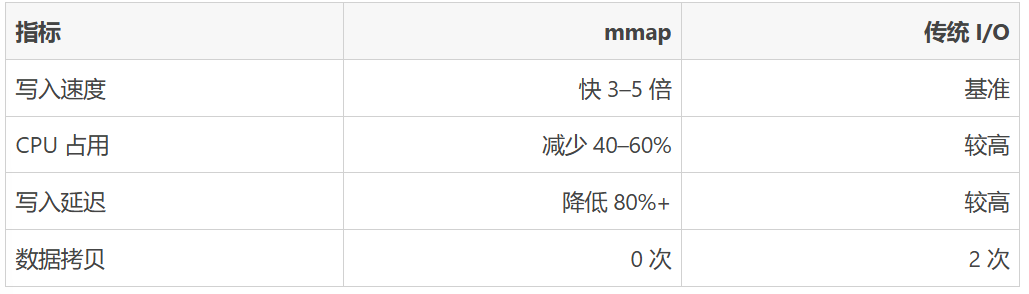 - 系统调用显著减少:写入阶段仅需 memcpy,flush 可异步