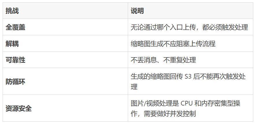 在我们的内容管理系统中,用户每天通过多种方式(Web 端直传、API 上传、后台批量导入等)向 S3 上传大量图片和视频文件。为了提升前端展示性能和用户体验,我们需要: