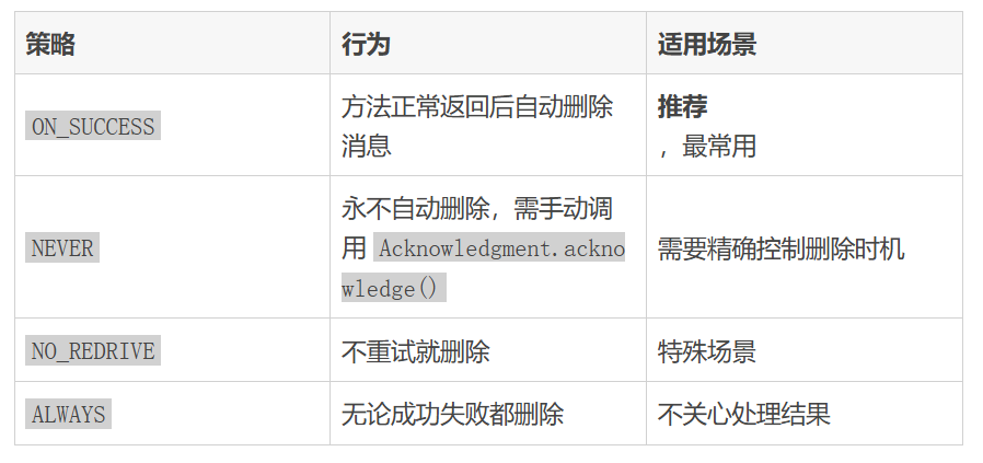3.配置消息删除策略为 ON_SUCCESS— 处理成功才删除,失败可重试