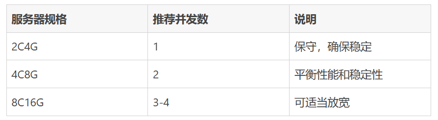// 4C8G 服务器推荐并发数为 2