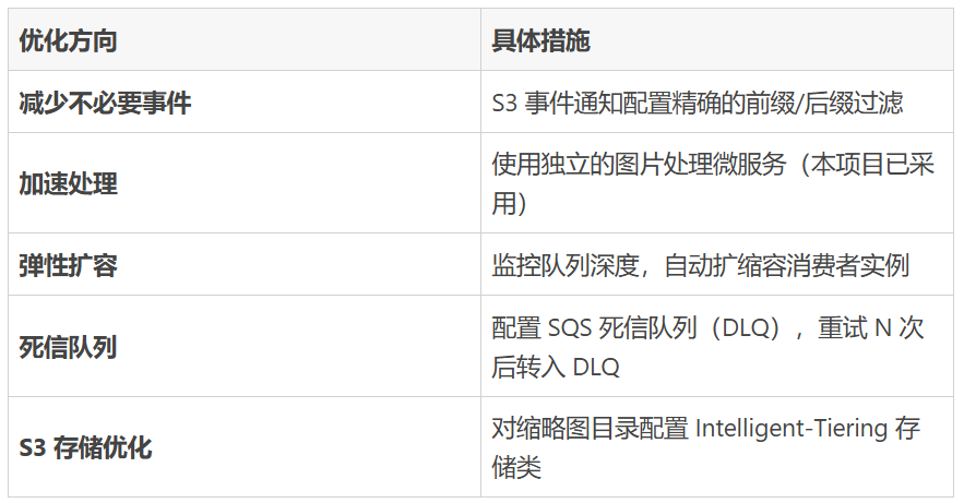 1.使用 SQS 标准队列 而非 FIFO 队列 — 缩略图生成不需要严格顺序,标准队列吞吐量更高且更便宜